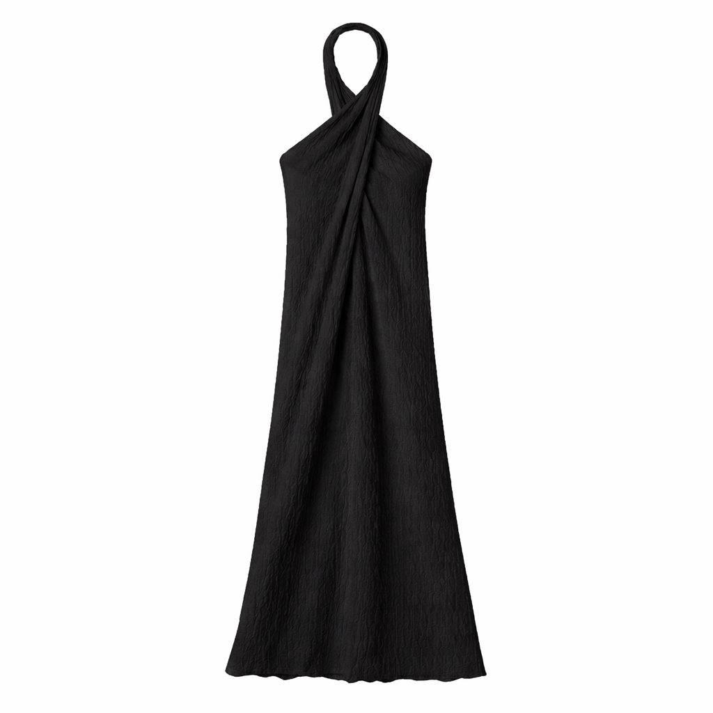 The Stella Dress is a sheer, cross-neck style that can be styled over the Mika Pant or your favorite swim.