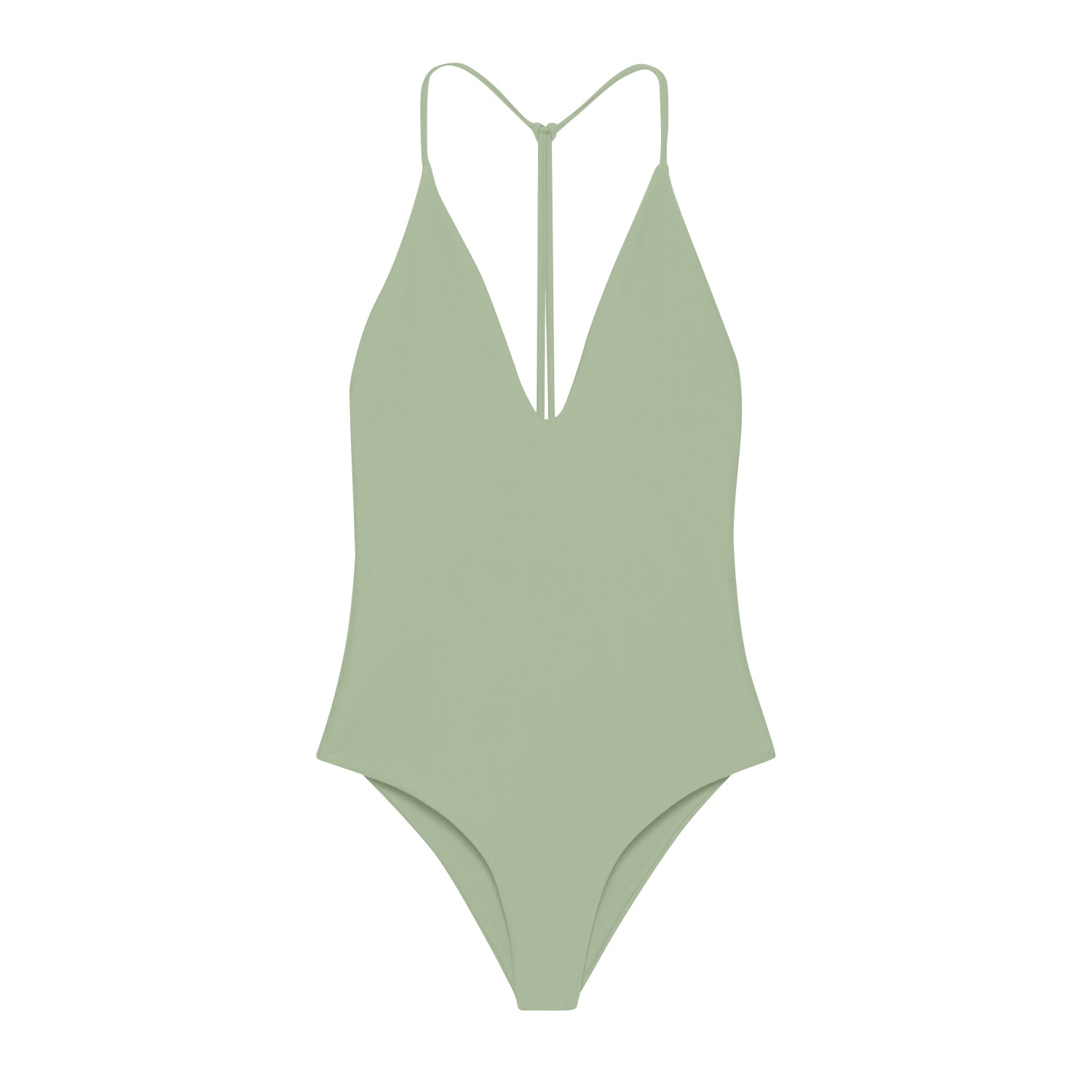 The All in One Piece Swimsuit is a versatile style that can easily transition into daywear. It features a deep V-neck and slender T-straps to highlight the back.