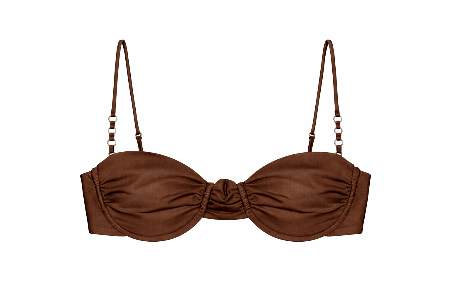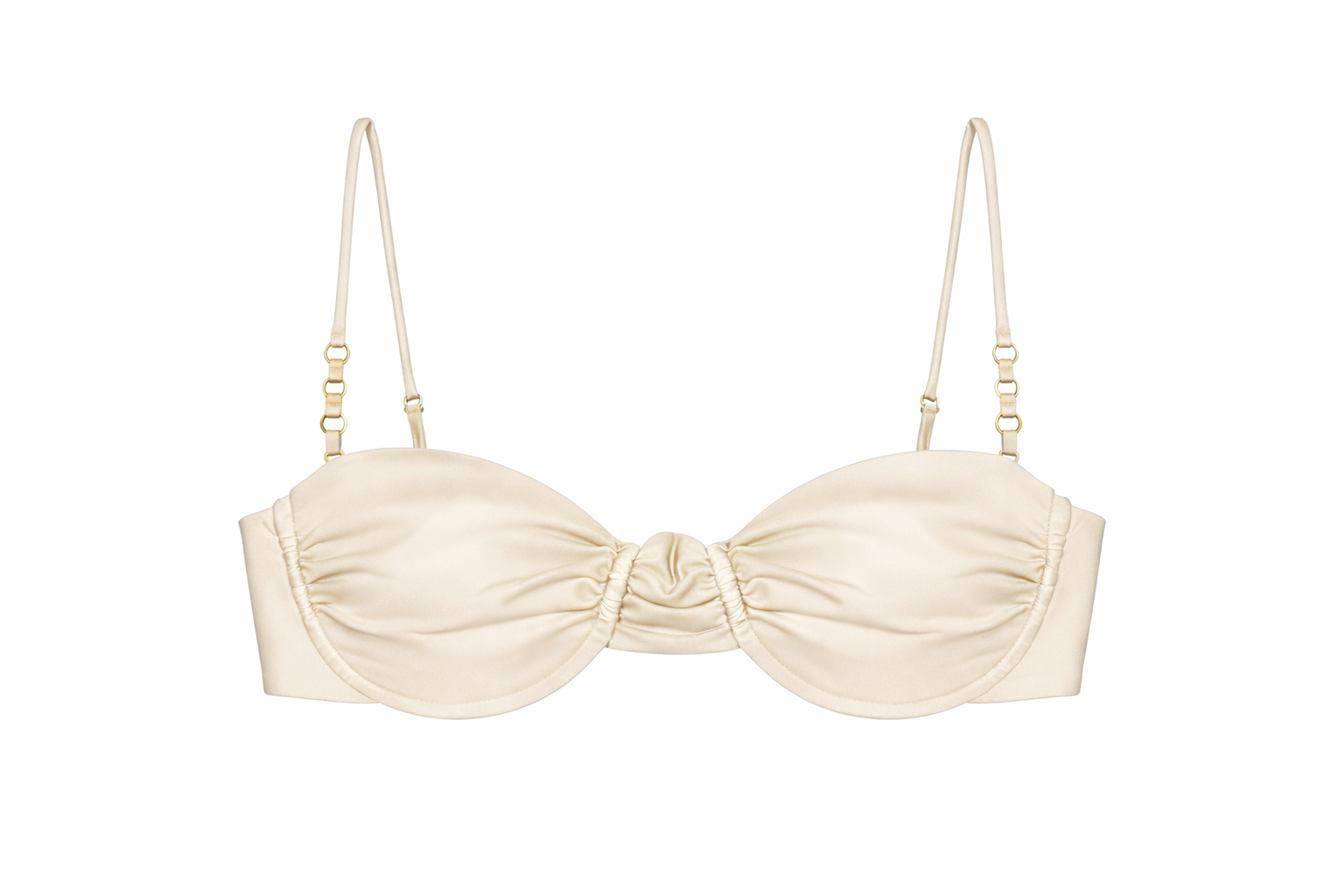 The Raina Bikini Top is a balconette style top designed with light ruching and underwire support. Finished with a hook closure and small gold ring detailing. Pair this style with the Soleil Bottom to complete the look.